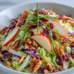 A fresh and vibrant Apple Cranberry Coleslaw combining crisp three-color coleslaw mix with sweet apples, tart dried cranberries, crunchy walnuts, and a tangy honey-ginger dressing. Perfect as a refreshing side dish for any meal or picnic.