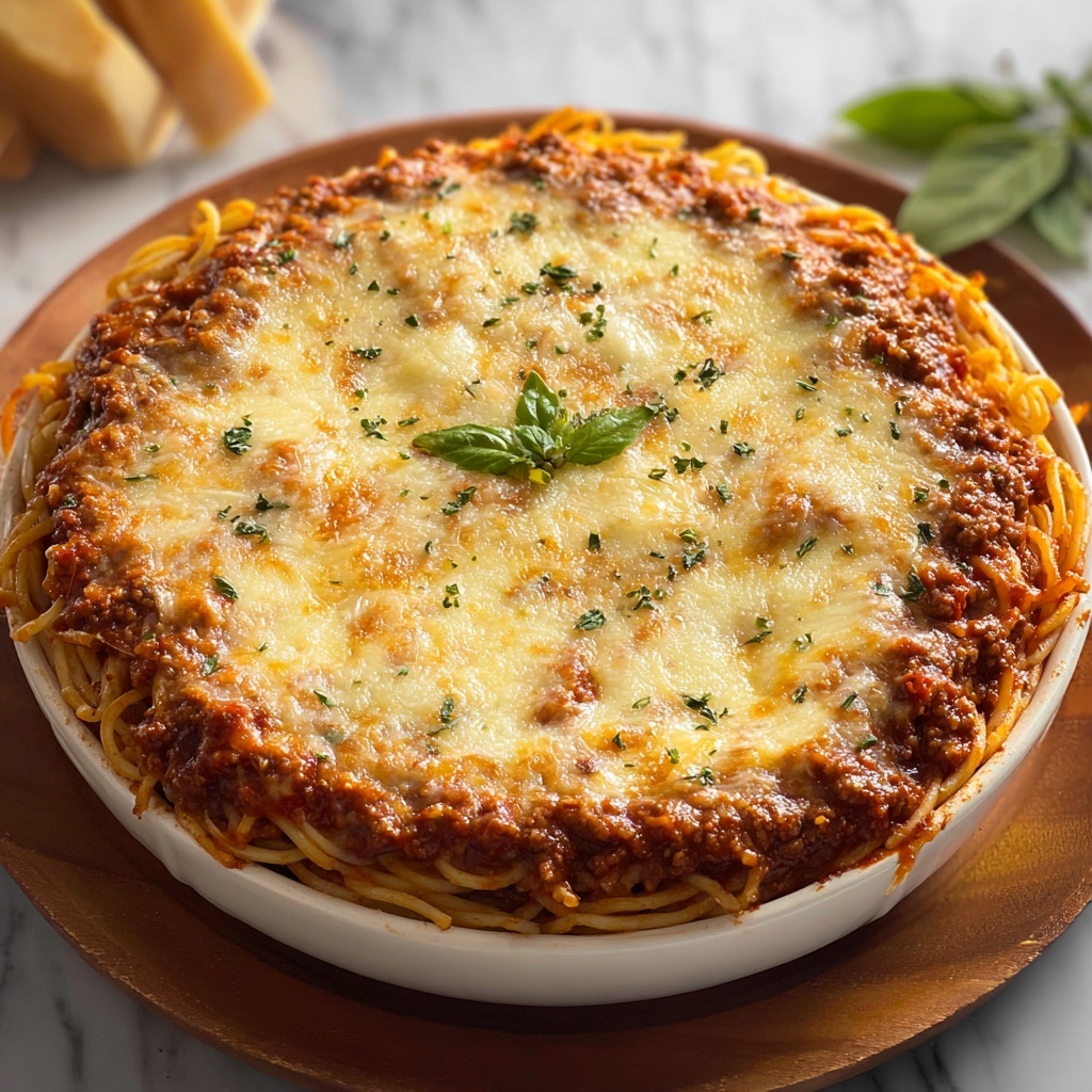 Begin by spreading a thin layer of the meat sauce across the bottom of your prepared baking dish. Gently layer the creamy spaghetti over the sauce, then pour the remaining meat sauce evenly over the top of the pasta. To finish, sprinkle the grated Parmesan cheese across the surface to add texture and that incredible golden crust after baking.