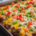 Delicious and colorful Bell Pepper Nachos made with seasoned ground beef, fresh bell peppers, onions, tomatoes, and melted Mexican cheese, baked to perfection for a quick and satisfying snack or meal.
