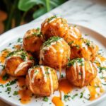 These Buffalo Chicken Meatballs are a spicy, flavorful appetizer perfect for game day or parties. Made with ground chicken and a blend of savory seasonings, they’re baked to golden perfection and tossed in a tangy buffalo wing sauce. Served with blue cheese or ranch dressing and garnished with fresh herbs, they offer a delicious kick with every bite.