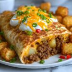 These Cheesy Potato Burritos combine crispy tater tots, seasoned ground beef, and a blend of melted cheddar and Monterey Jack cheeses wrapped in soft flour tortillas. Topped with chipotle sauce and sour cream, they make a comforting and flavorful meal perfect for any occasion.