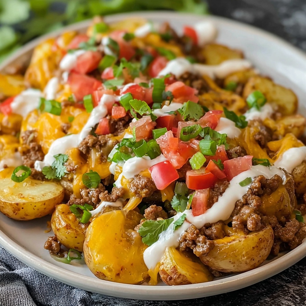 If you are craving something that combines all the best flavors of a taco with the comfort of crispy roasted potatoes, then this Cheesy Taco Potatoes Recipe is precisely what you need. Bursting with smoky spices, melty cheddar and Monterey Jack cheeses, and topped with fresh green onions and cilantro, this dish is a lively celebration of textures and bold tastes. Whether you need a satisfying snack, a crowd-pleasing appetizer, or a side that steals the spotlight, these cheesy taco potatoes deliver delight in every bite.
