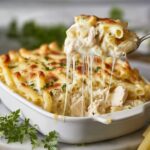 This creamy Chicken Alfredo Casserole is a comforting, cheesy baked pasta dish that combines tender chicken, penne pasta, and rich Alfredo sauce topped with melted mozzarella and cheddar cheeses. Perfect for a family dinner, it’s easy to prepare and delivers classic Italian-American flavors with a satisfying baked finish.