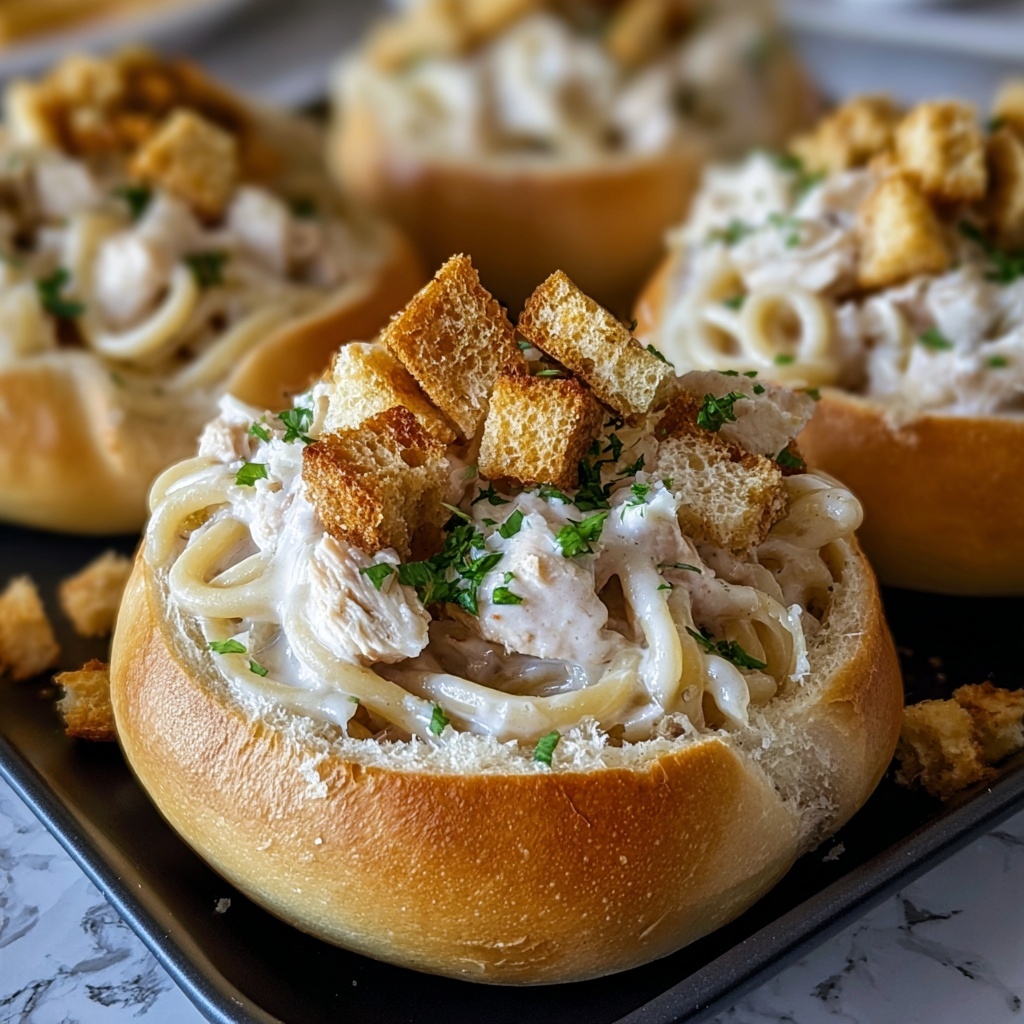 How to Serve Chicken Alfredo Garlic Bread Bowls Recipe