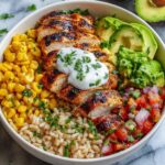 This vibrant Chicken Burrito Bowl is a healthy and flavorful meal perfect for quick lunches or dinners. Featuring tender marinated chicken grilled to perfection, nestled atop a bed of brown rice and mixed greens, and topped with fresh avocado, black beans, sweet corn, and zesty lime juice, this bowl offers a delicious balance of protein, fiber, and fresh veggies. A dollop of Greek yogurt adds creaminess without the heaviness, making it a wholesome, satisfying dish that’s easy to prepare in under 30 minutes.