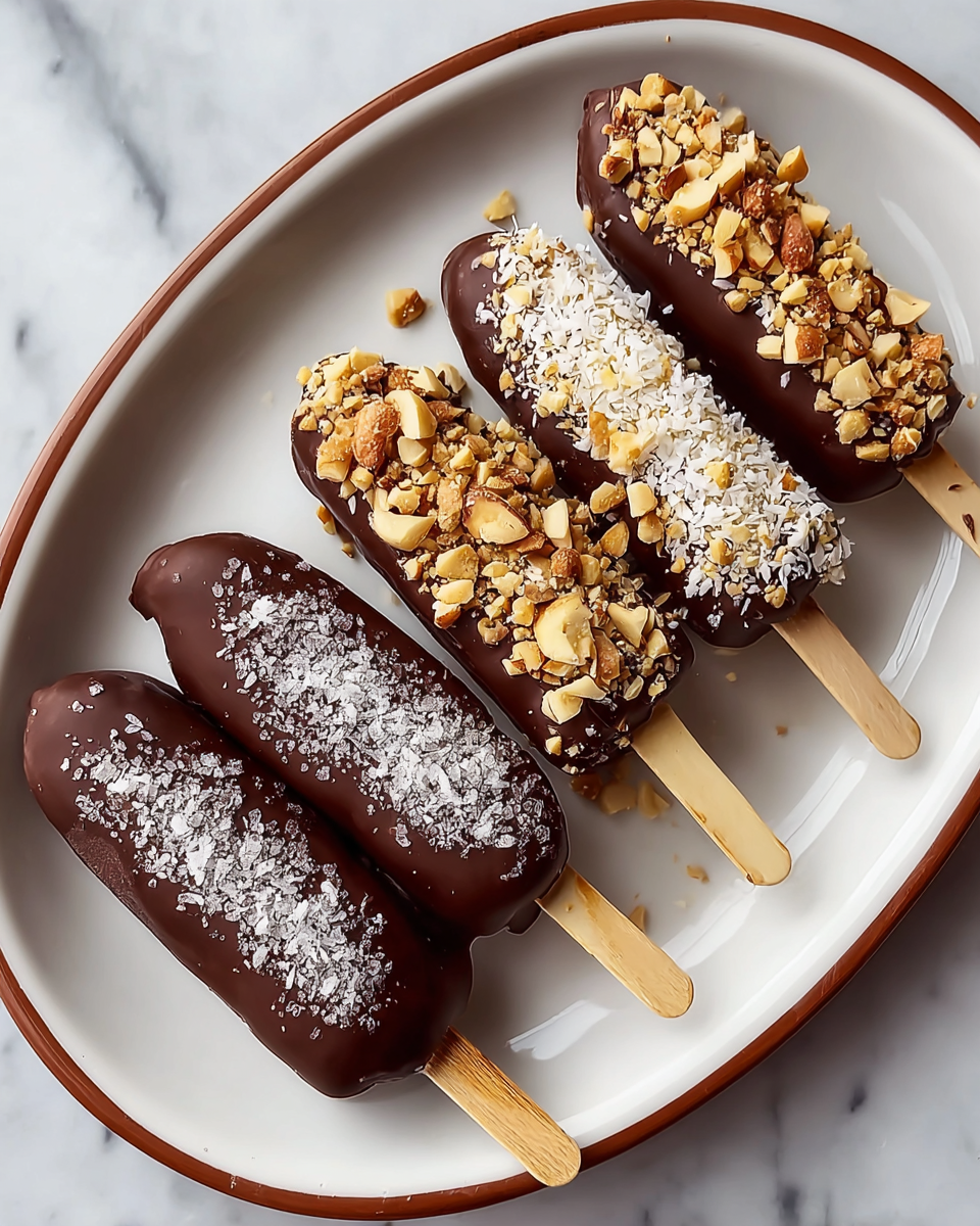 Once your bananas are frozen solid and your chocolate is silky smooth, it’s time for the fun part. Remove your banana pops from the freezer and one by one, dunk them into the melted chocolate, letting the excess drip off like a pro. While the chocolate is still wet, sprinkle your favorite toppings—think chopped peanuts, shredded coconut, granola, cacao nibs, and a pinch of flaky salt. Each topping adds a unique character to every bite, exploding with flavors and textures.