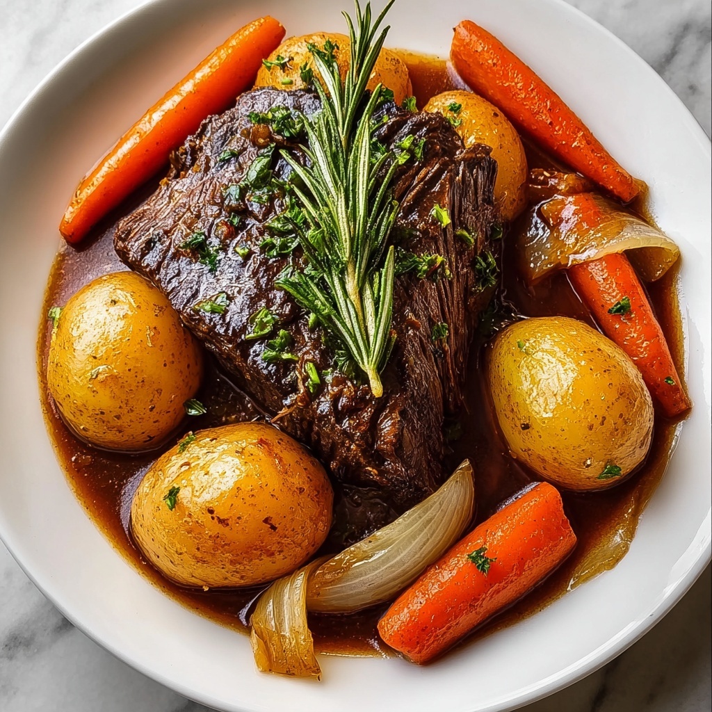 For a fancier touch, serve the pot roast in individual deep plates with vegetables artfully arranged around the meat and sauce spooned generously. You can also elevate the experience by turning leftovers into hearty pot roast sandwiches or topping creamy polenta with shredded roast and gravy for a modern spin.