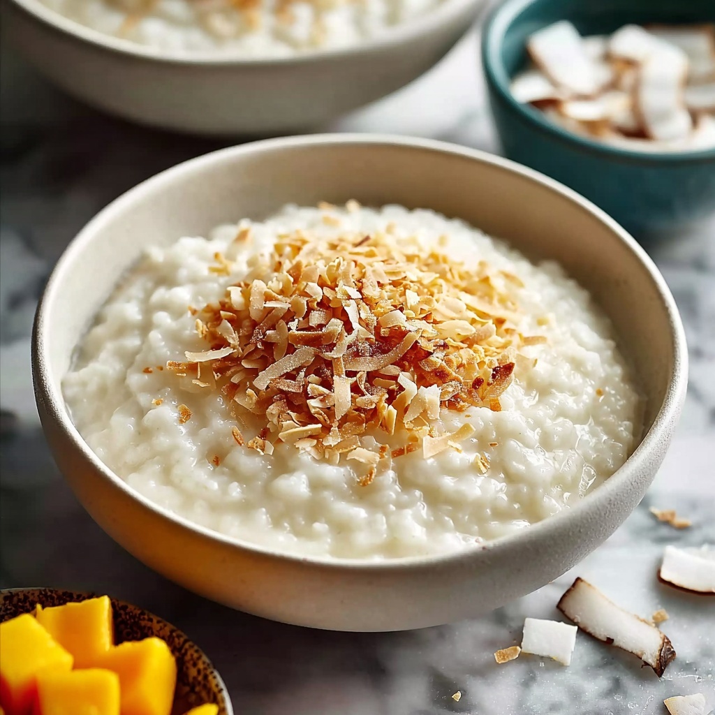 - Serve and garnish: Serve your coconut rice pudding warm or chilled. Garnish with shredded unsweetened coconut and fresh fruit such as mango or berries if desired for added flavor and texture.