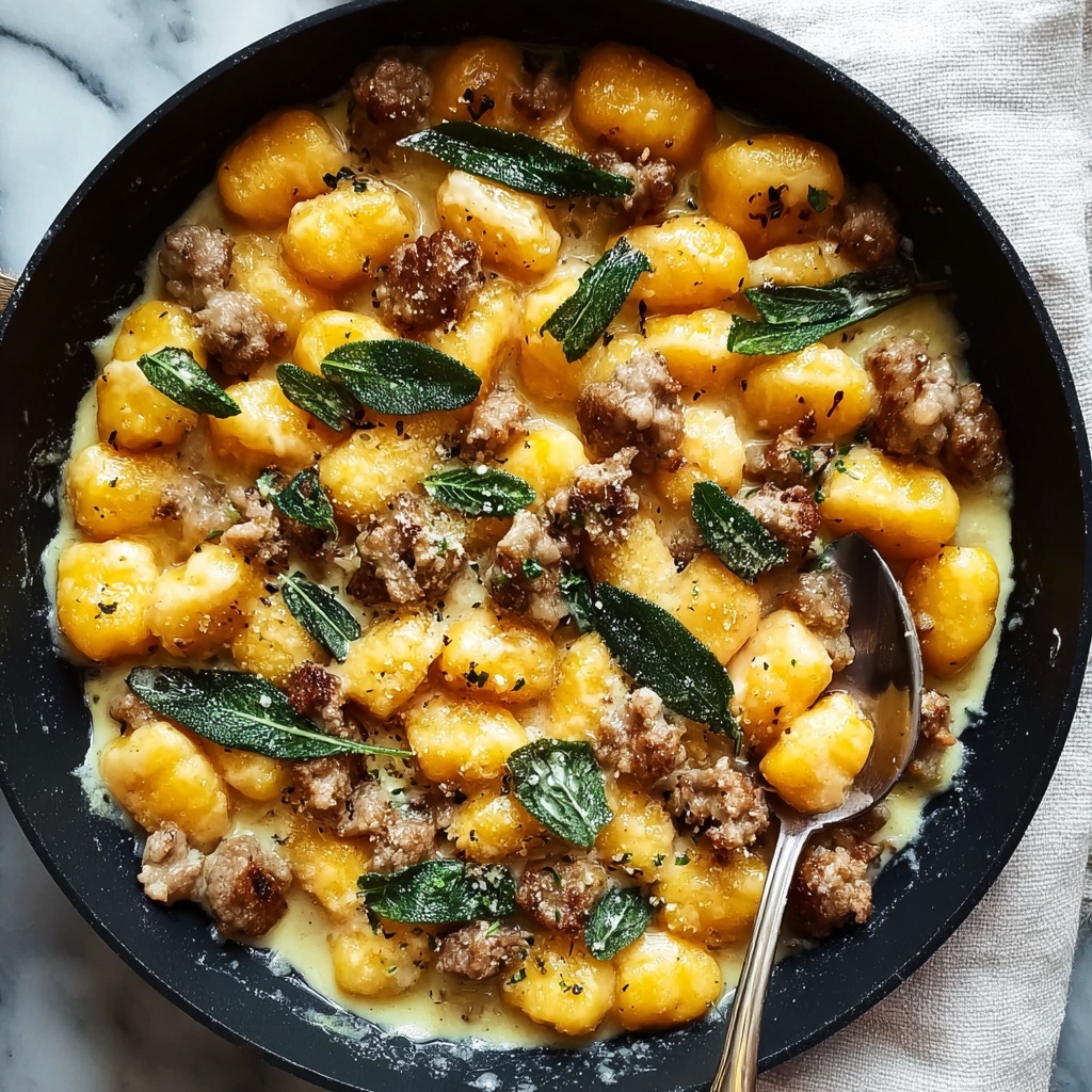 This Creamy Butternut Squash Gnocchi with Sausage is a comforting and rich dish combining tender gnocchi, flavorful Italian sausage, and a smooth butternut squash cream sauce. The roasted butternut squash adds natural sweetness and depth, while the garlic and parmesan bring a savory finish. Perfect for a cozy dinner, this recipe yields a satisfying meal for four.