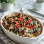 In a large pan over medium heat, melt the butter and add the minced garlic first to awaken its flavor. Then toss in the bell peppers, onions, and mushrooms. Cook them gently until the onions turn translucent and the peppers soften, about 5 to 10 minutes. Don’t forget to squeeze out all the excess water from the spinach before mixing it in, so your casserole doesn’t get watery.