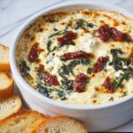 This Creamy Tuscan Dip is a rich and flavorful appetizer combining cream cheese, sour cream, mozzarella, Parmesan, garlic, Italian seasoning, sun-dried tomatoes, and spinach. Baked until bubbly and golden, it’s perfect for serving warm with bread or crackers at any party or family gathering.