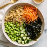 Use shelled edamame that’s been cooked (boiled or steamed) and cooled completely. Fresh or frozen edamame both work well, just ensure they’re fully thawed and dry before mixing with the veggies to avoid sogginess.