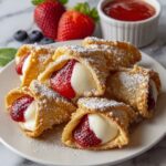 Place the golden fried cheesecake bites on a plate, spoon the luscious macerated strawberries over them, and finish with a generous dusting of powdered sugar. The result is an impressive dessert bursting with flavor and texture that’s perfect for sharing or a special treat.