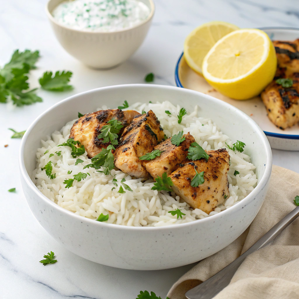 7. Serve: Serve the chicken and rice warm, allowing the cool creaminess of the tzatziki to complement the savory baked chicken and fluffy rice.