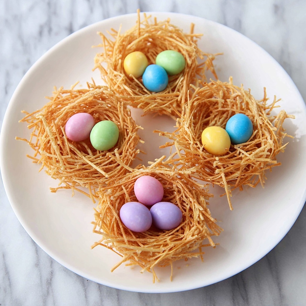 Using a spoon, drop portions of the coated potato sticks onto a baking sheet lined with parchment or wax paper. While the clusters are still soft, press three Robin’s Eggs candies or pastel M&M’s on top of each one. This adds a festive pop of color and a sweet crunch that’s pure Easter magic.