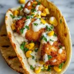 - Assemble the Tacos: Place fried chicken strips on each tortilla, top with a generous spoonful of the creamy street corn mixture, then drizzle with jalapeño lime ranch. Sprinkle with the remaining cheese and chopped fresh cilantro. Serve immediately with lime wedges on the side for extra zest.