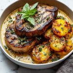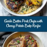 This Garlic Butter Pork Chops with Cheesy Potato Bake recipe features juicy pork chops seared in flavorful garlic butter, paired with a rich, creamy cheesy potato bake infused with thyme and rosemary. Tender potatoes layered with cheddar and Parmesan cheese create a decadent side that complements the savory pork perfectly, all baked together for a comforting, delicious meal.