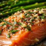 To reheat, gently warm the salmon and asparagus in a low oven at 275°F (135°C) for about 10 minutes to prevent drying out. Alternatively, use a microwave with short intervals to keep the garlic butter sauce luscious. Avoid overheating to preserve the silky texture of the salmon.