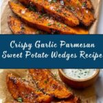Crispy and flavorful Garlic Parmesan Sweet Potato Wedges baked to golden perfection, seasoned with a blend of herbs and spices for a deliciously cheesy and savory side dish or snack.