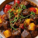 Just before serving, stir in the red wine vinegar for a bright, tangy lift that perfectly balances the deep, savory flavors of the stew. This final touch brings the dish to life, making every spoonful exciting and satisfying.