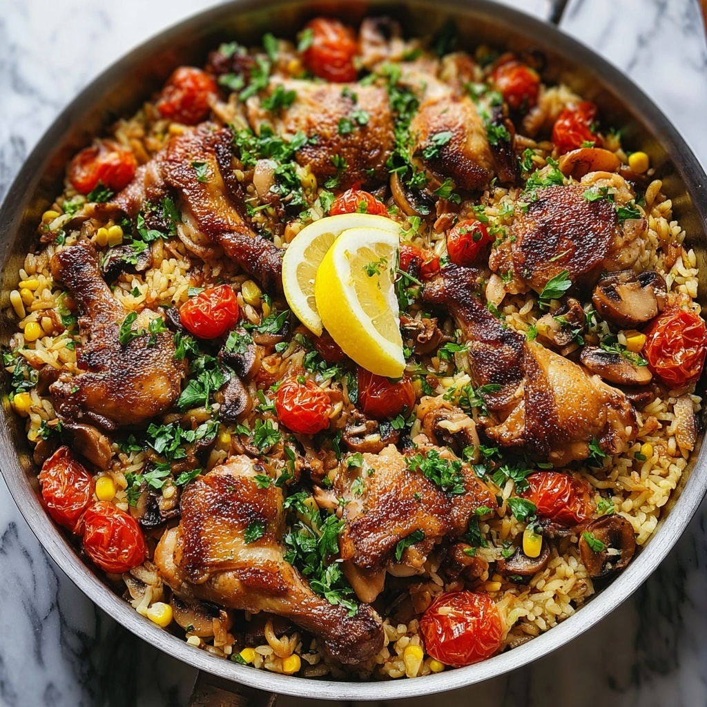 Greek Chicken and Lemon Rice is a flavorful one-pan dish featuring tender, oven-baked chicken thighs seasoned with oregano and paprika, served on a bed of aromatic lemon-infused rice. This easy-to-make recipe combines Mediterranean herbs, zesty lemon, and perfectly cooked rice, delivering a comforting yet bright meal perfect for family dinners.