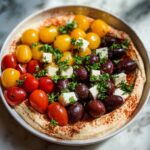 A vibrant and flavorful Greek Style Loaded Hummus topped with fresh cherry tomatoes, kalamata olives, cucumbers, red onion, pepperoncini, and herbs. This no-cook Mediterranean-inspired dip is perfect as an appetizer or snack, featuring a creamy hummus base enriched with garlic, oregano, olive oil, and toasted pine nuts for added texture and taste.