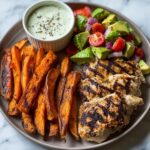 This flavorful and balanced meal features tender grilled chicken tenders marinated in a zesty spice blend, paired with crispy oven-baked sweet potato fries and a refreshing avocado salsa. Accompanied by a creamy garlic-dill dipping sauce, this dish offers a delightful combination of textures and vibrant flavors, perfect for a satisfying weeknight dinner or weekend gathering.