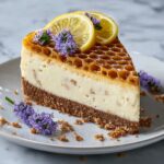 - Garnish and serve: Before serving, top the cheesecake with fresh honeycomb chunks. Optionally drizzle with extra honey and sprinkle with dried lavender buds or lemon zest for a beautiful and aromatic finish.