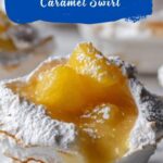 After the meringues have cooled completely, spoon in the chilled mango curd and drizzle with the miso caramel. Use a toothpick or skewer to gently swirl the caramel into the curd, creating those beautiful caramel ribbons that look almost too good to eat.