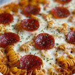 Grab a greased 9×13-inch baking dish and transfer your pasta mixture inside, spreading it out evenly. Now sprinkle the remaining mozzarella cheese, followed by the grated Parmesan, and finally arrange the rest of the pepperoni on top. This layering is what creates that golden, bubbling, cheesy crust that’s impossible to resist.