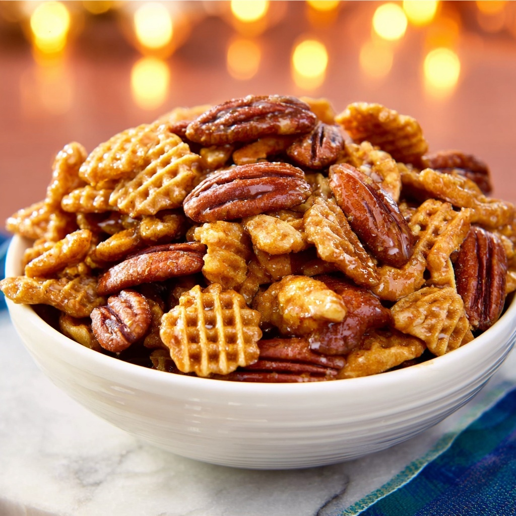 Praline Crunch is a delightful sweet and crunchy treat combining Crispix cereal and pecan halves coated in a buttery, caramelized praline syrup. Baked low and slow, this snack offers a perfect balance of sweetness and nuttiness, ideal for holiday gatherings or everyday indulgence.