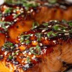 6. Serve: Remove the salmon from the skillet and plate immediately. Garnish with sliced green onions and sesame seeds for added flavor and texture. Serve hot with steamed rice and sautéed vegetables for a complete meal.