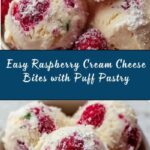 - Assemble Bites: Place a small dollop of the cream cheese mixture in the center of each puff pastry square. Then, top each with one or two fresh raspberries or a small spoonful of raspberry preserves for added sweetness and fruitiness.