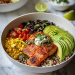 A vibrant and healthy Salmon Burrito Bowl combining perfectly seasoned baked salmon with nutritious brown rice, black beans, fresh vegetables, and a tangy Greek yogurt lime dressing. This recipe offers a quick, flavorful, and balanced meal with Mexican-inspired flavors, ready in just 25 minutes.