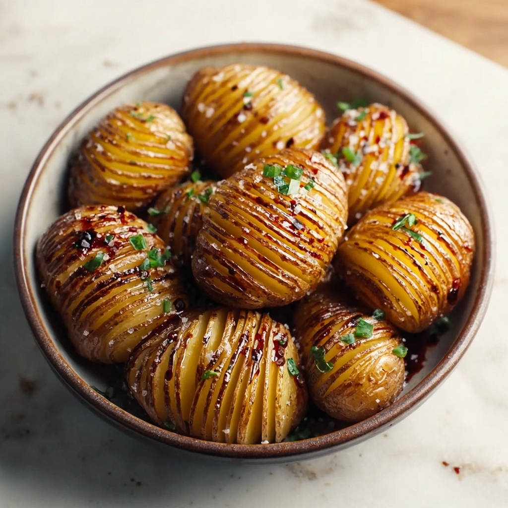 Try to slice the potatoes about 1/8 inch thick without cutting all the way through. This creates the classic Hasselback fan effect, allowing more surface area to crisp while keeping the potato intact and tender inside.