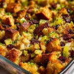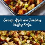 This Sausage, Apple, and Cranberry Stuffing is a savory and slightly sweet holiday side dish that combines Italian pork sausage, crisp apples, and tart dried cranberries with aromatic herbs and tender bread cubes. Perfectly baked to a golden crisp on top, this stuffing brings festive flavors and comforting textures to your Thanksgiving or holiday meal.