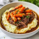 This Slow Cooker Garlic Herb Pot Roast is a hearty, tender beef chuck roast cooked low and slow with aromatic garlic, herbs, and vegetables. The beef is first browned to create a flavorful crust, then slow-cooked with baby carrots, onions, potatoes, and a savory broth mixture until it melts in your mouth. Perfect for a comforting family dinner, served with mashed potatoes and garnished with fresh parsley or thyme.