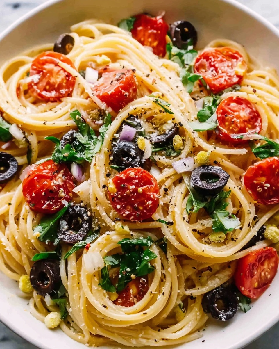 This chilled Spaghetti Salad is a vibrant, refreshing dish perfect for warm days or as a tasty side. Featuring al dente spaghetti tossed with crisp cherry tomatoes, cucumber, red bell pepper, red onion, olives, and feta cheese, all coated in a zesty vinaigrette dressing made from olive oil, red wine vinegar, Dijon mustard, and garlic. Ready in just about 20 minutes and ideal for make-ahead meals, this salad beautifully blends fresh flavors with a satisfying bite.