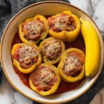 Stuffed Banana Peppers in Savory Tomato Sauce is a delicious Italian-American main course featuring tender banana peppers filled with a flavorful mixture of ground beef, cooked rice, Parmesan cheese, and aromatic seasonings. Baked in a rich tomato sauce, this dish offers a perfect balance of savory flavors and comforting textures ideal for a family meal.