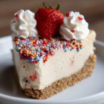 After the cheesecake has cooled to room temperature, remove it from the oven and refrigerate it for at least 4 hours, or better yet, overnight. This chilling step allows the flavors to meld beautifully and the texture to set firm yet creamy. When you’re ready to serve, top the cheesecake with a generous layer of whipped cream and sprinkle on colorful sprinkles for that extra touch of fun and flair.