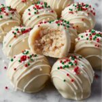 3. Coat Truffles: Melt the vanilla-flavored melting wafers following the package instructions, usually by heating in short bursts in the microwave or using a double boiler until smooth. Using a fork, dip each chilled truffle ball into the melted wafers, fully coating each one. Return the coated truffles to the sheet, drizzle with additional melted wafers, and sprinkle with red and green decorative sprinkles.