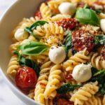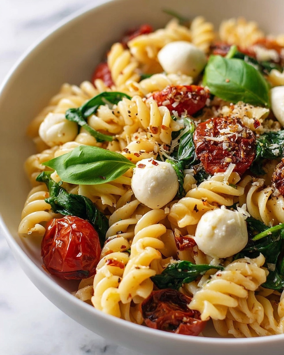 A vibrant and refreshing Mediterranean-inspired pasta salad featuring rotini pasta tossed with sun-dried tomatoes, cherry tomatoes, feta cheese, Kalamata olives, red onion, fresh basil, and a zesty homemade dressing. Perfect as a light side dish or a vegetarian-friendly meal.