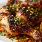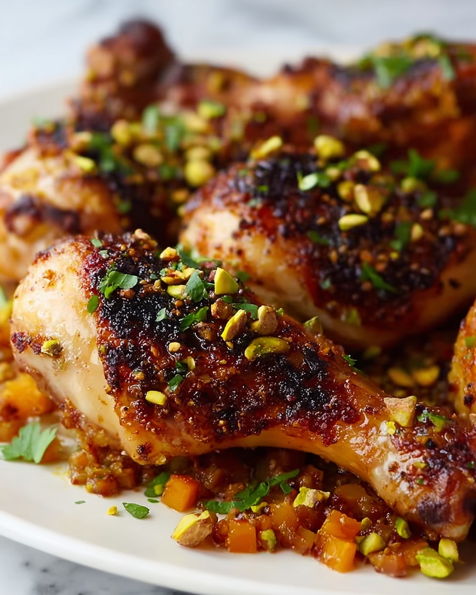 5. Serve: Carefully transfer the roasted chicken and vegetables to a serving platter. Sprinkle with chopped Italian parsley, sliced scallions, and chopped salted pistachios. Serve hot and enjoy a harmonious balance of sweet, spicy, and nutty flavors.