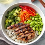 This vibrant Teriyaki Chicken Power Bowls recipe features juicy grilled chicken breast marinated in a flavorful teriyaki sauce, paired with a medley of sautéed and steamed vegetables including edamame, bell pepper, broccoli, carrots, and red onion. Served over rice with a savory glaze and optional sesame seed garnish, these bowls make a nutritious and balanced meal perfect for meal prepping or a quick dinner packed with protein and veggies.