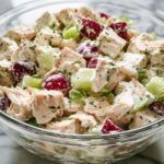 A creamy and flavorful chicken salad featuring shredded chicken mixed with a tangy blend of mayonnaise, Greek yogurt, Dijon mustard, and fresh lemon juice. Enhanced with crunchy celery, sweet dried cranberries or grapes, crunchy walnuts or almonds, and fresh parsley, this versatile dish can be served on its own, as a sandwich filling, or over greens for a satisfying meal.