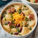 This Ultimate Creamy Potato Soup is a comforting, hearty dish perfect for chilly days. Featuring tender potatoes blended into a smooth, velvety base enriched with heavy cream and seasoned with thyme, it’s elevated by crispy sausage and optional cheddar cheese and green onions for an indulgent finish.