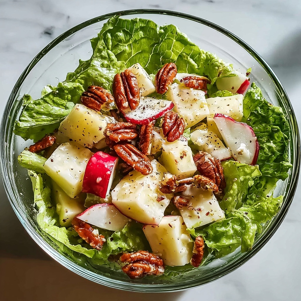 Enhance the beauty and flavor of your salad with a sprinkle of chopped fresh parsley or a few whole walnut halves for that extra crunch. A few crisp lettuce leaves underneath create an elegant presentation and add an additional layer of texture.